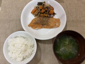 1月21日(水)ごはん 大根と水菜のみそ汁 鮭の塩焼き 五目煮