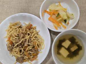 3月30日 ソース焼きそば わかめスープ 白菜と人参の甘酢和え