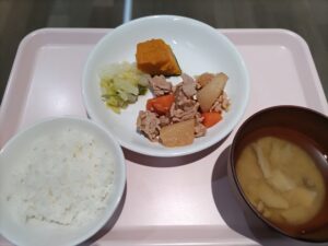 10月27日 ご飯 きのこのみそ汁 豚肉と大根の煮物 白菜の甘酢和え 蒸しかぼちゃ