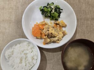 12月9日 ごはん キャベツとれんこんのみそ汁 鶏肉と車麩の卵とじ 小松菜ともやしのさっぱり和え