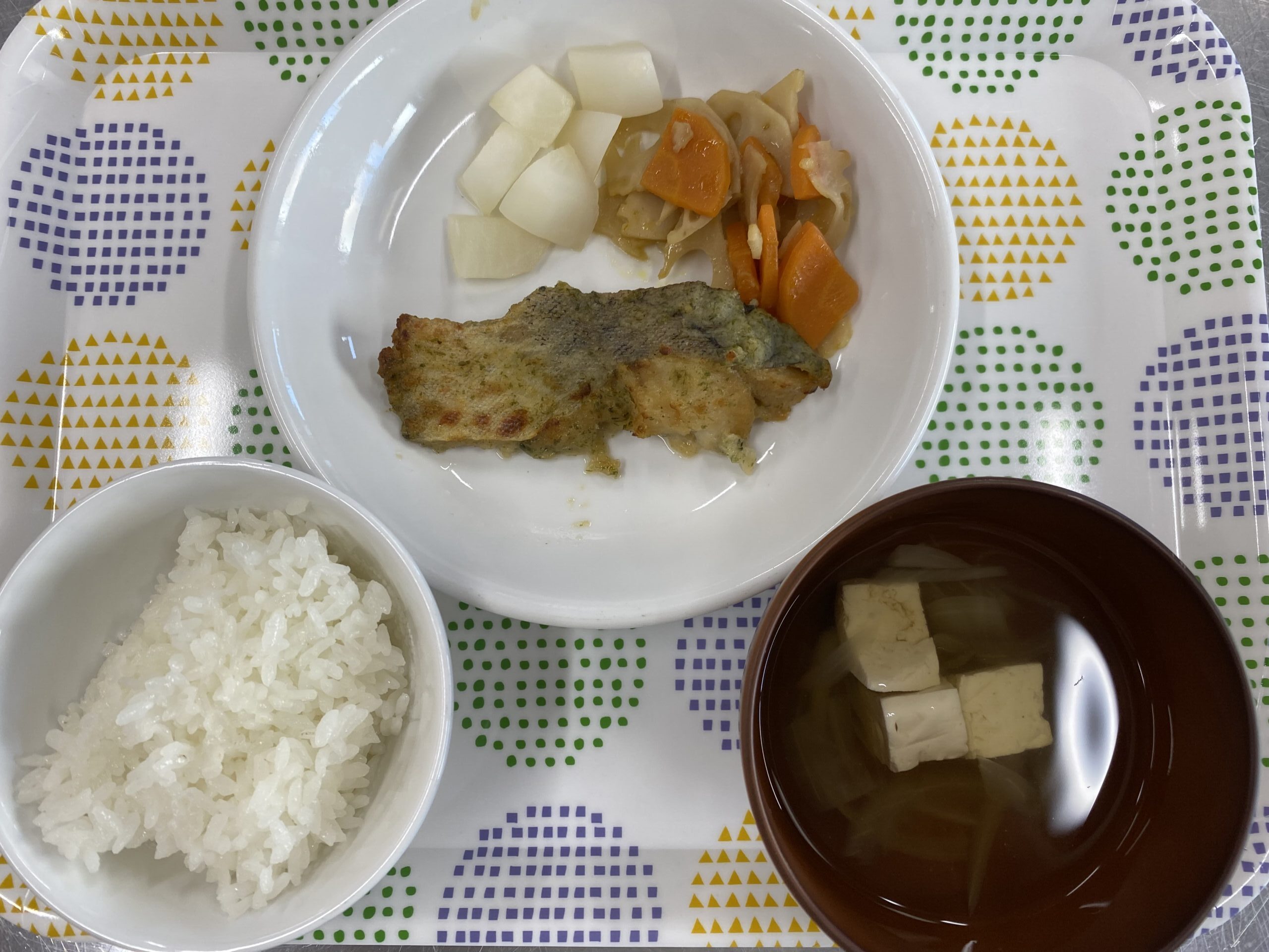 11月17日 ご飯 豆腐のすまし汁 魚の風味焼き れんこんのきんぴら煮 かぶの甘酢和え