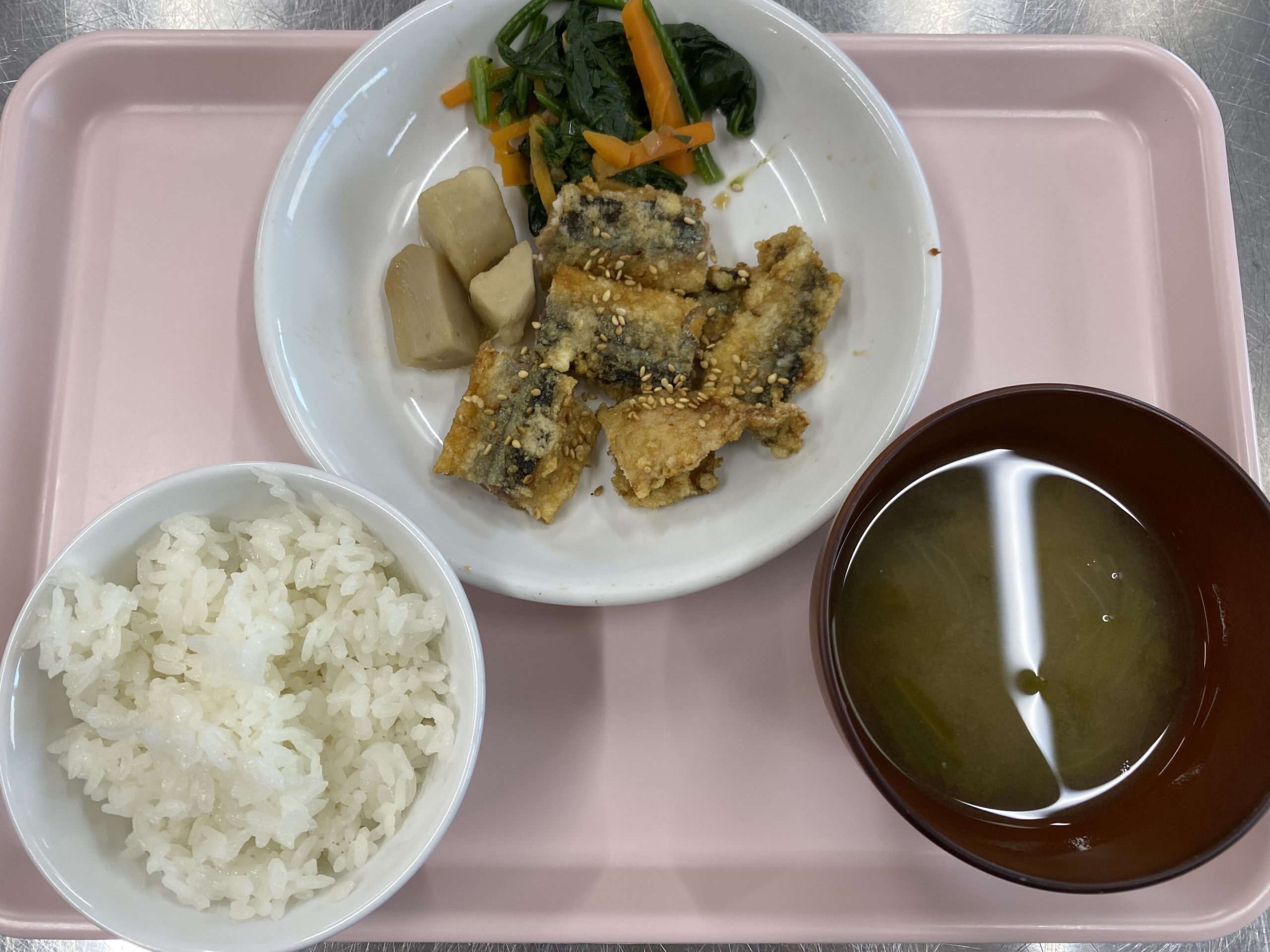 11月12日 ご飯 レタスと舞茸のみそ汁 さんまの蒲焼き 里芋の煮っころがし ほうれん草の梅肉和え
