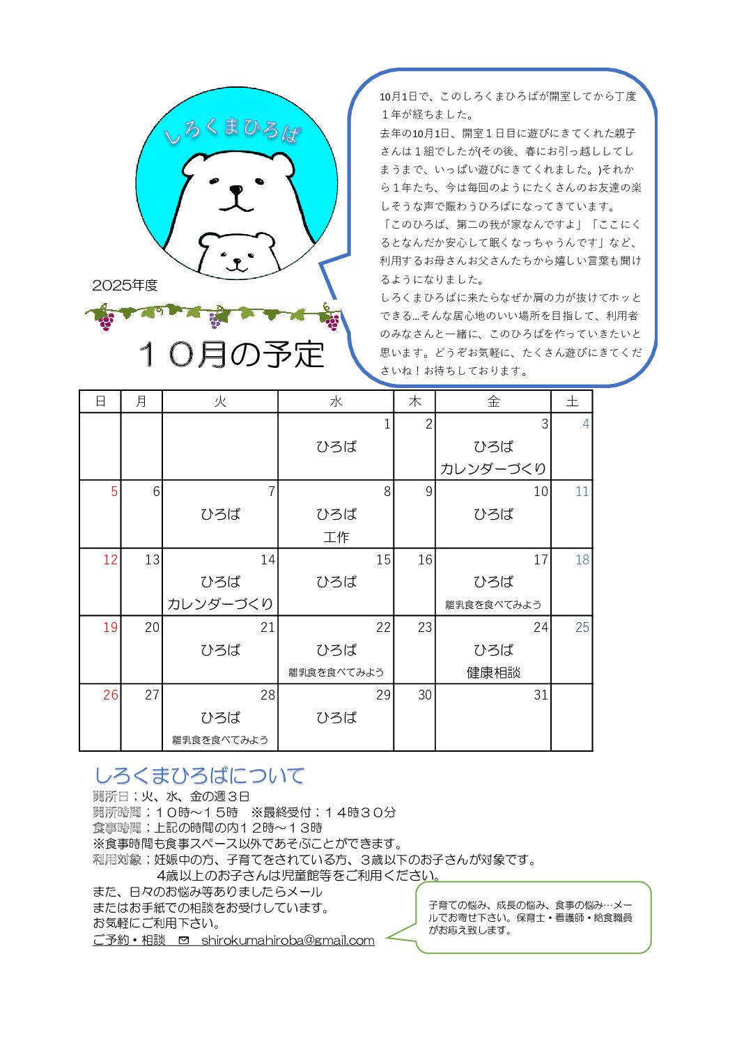 9月の予定を公開しました。 ぜひ遊びにきてください! ひろば2025.10月カレ...
