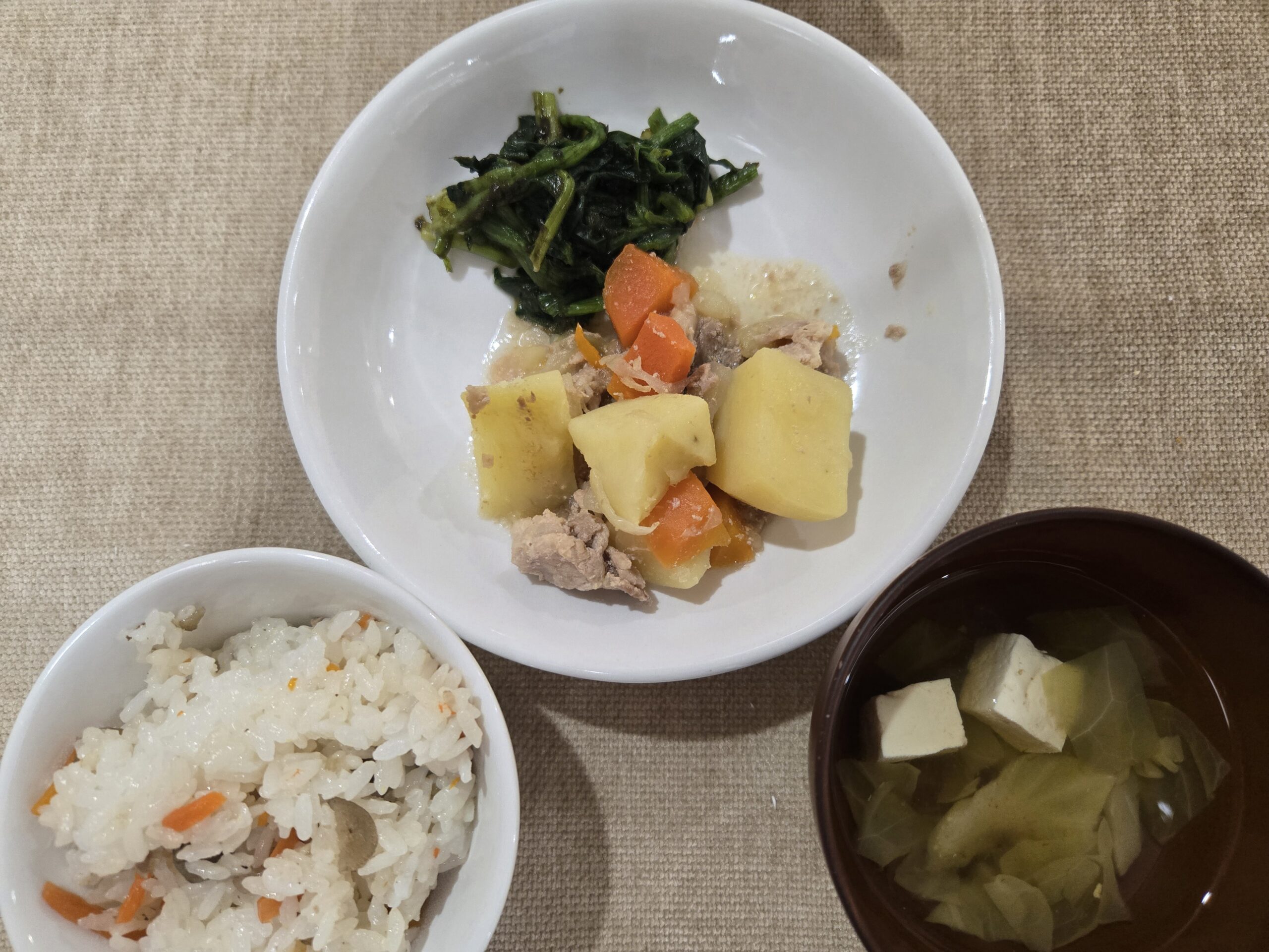 2月17日 鶏ごぼうご飯 キャベツと豆腐のすまし汁 塩じゃが ほうれん草の磯和え