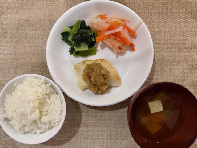 1月28日 ごはん かぼちゃのみそ汁 メカジキの照り焼き カリフラワーのごま和え 小松菜のお浸し