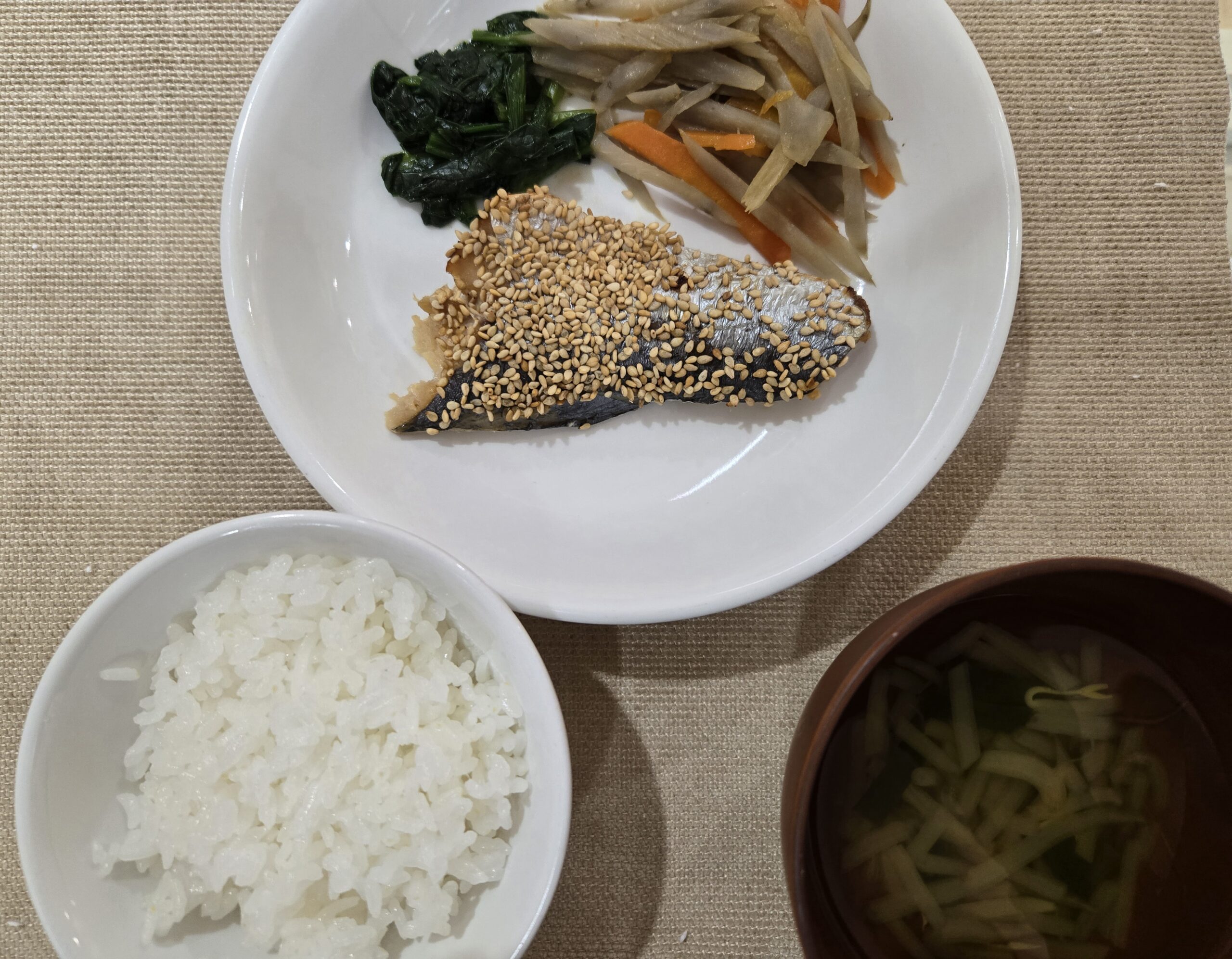 3月6日 ごはん もやしとにらのすまし汁 さわらのごま照り焼き 人参とごぼうのみそきんぴら ほうれん草のお浸し