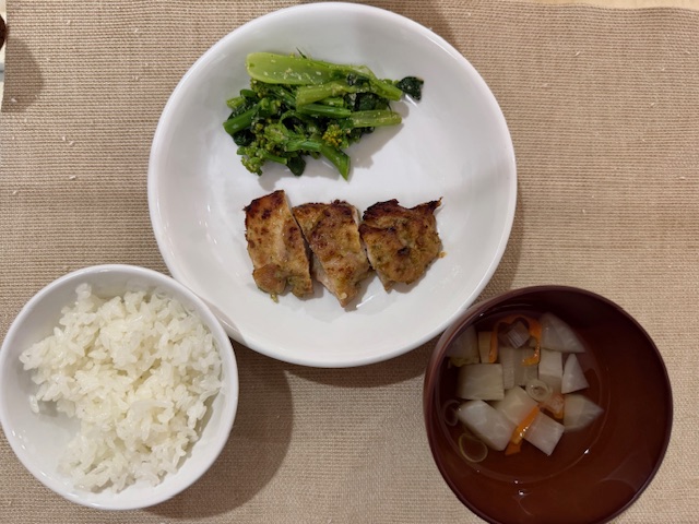 3月3日(火)ごはん かぶのすまし汁 鶏肉の風味焼き 菜の花と小松菜のごま和え