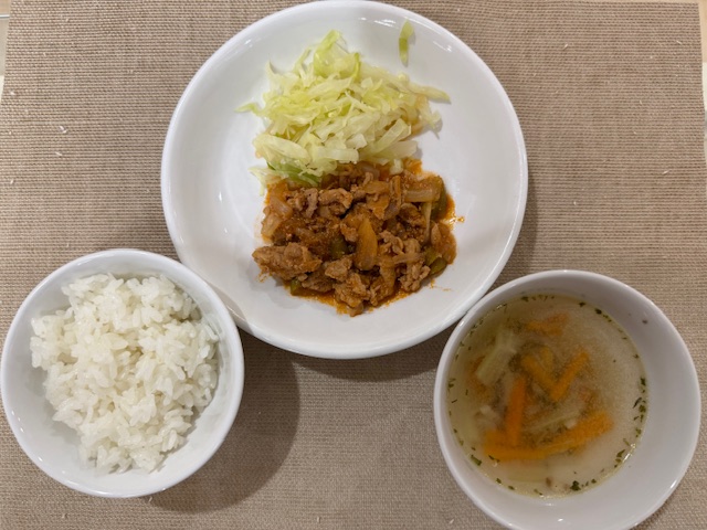 4月6日(月)ごはん ジュリエンヌスープ 豚肉のトマト煮 ボイルキャベツ
